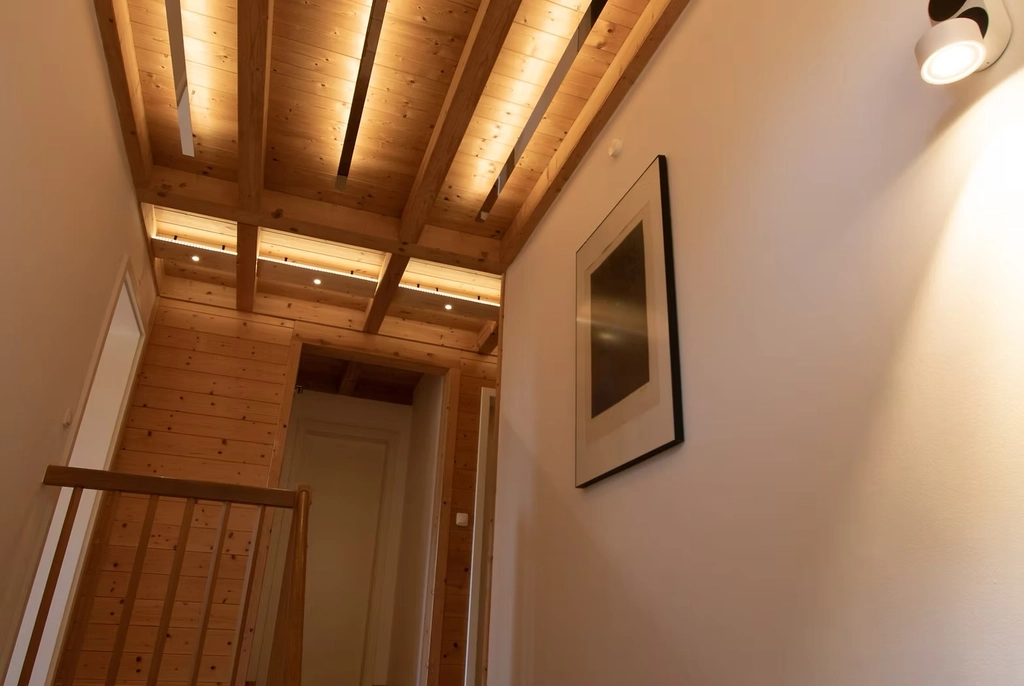Unsere Lösung: Wir arbeiten mit gezielter, indirekter Beleuchtung, um Decken optisch anzuheben und Räume heller, offener und freundlicher wirken zu lassen. Dabei setzen wir auf warme Lichtfarben, die mit den Holzoberflächen harmonieren, und schaffen so eine angenehme Atmosphäre, ohne die natürliche Materialwirkung zu zerstören.