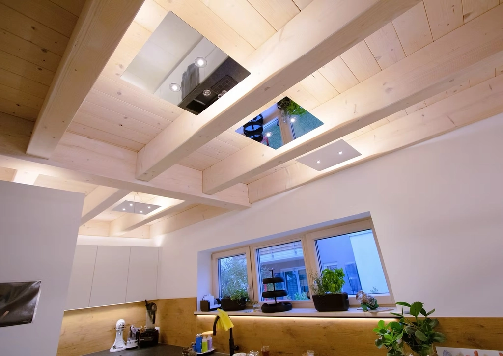 In Holzhäusern entsteht oft eine gewisse optische Schwere, da dunkle Holzdecken und -wände Licht absorbieren. Herkömmliche Beleuchtung schafft es selten, diese optische Dichte aufzulösen – der Raum wirkt dann niedrig und drückend.